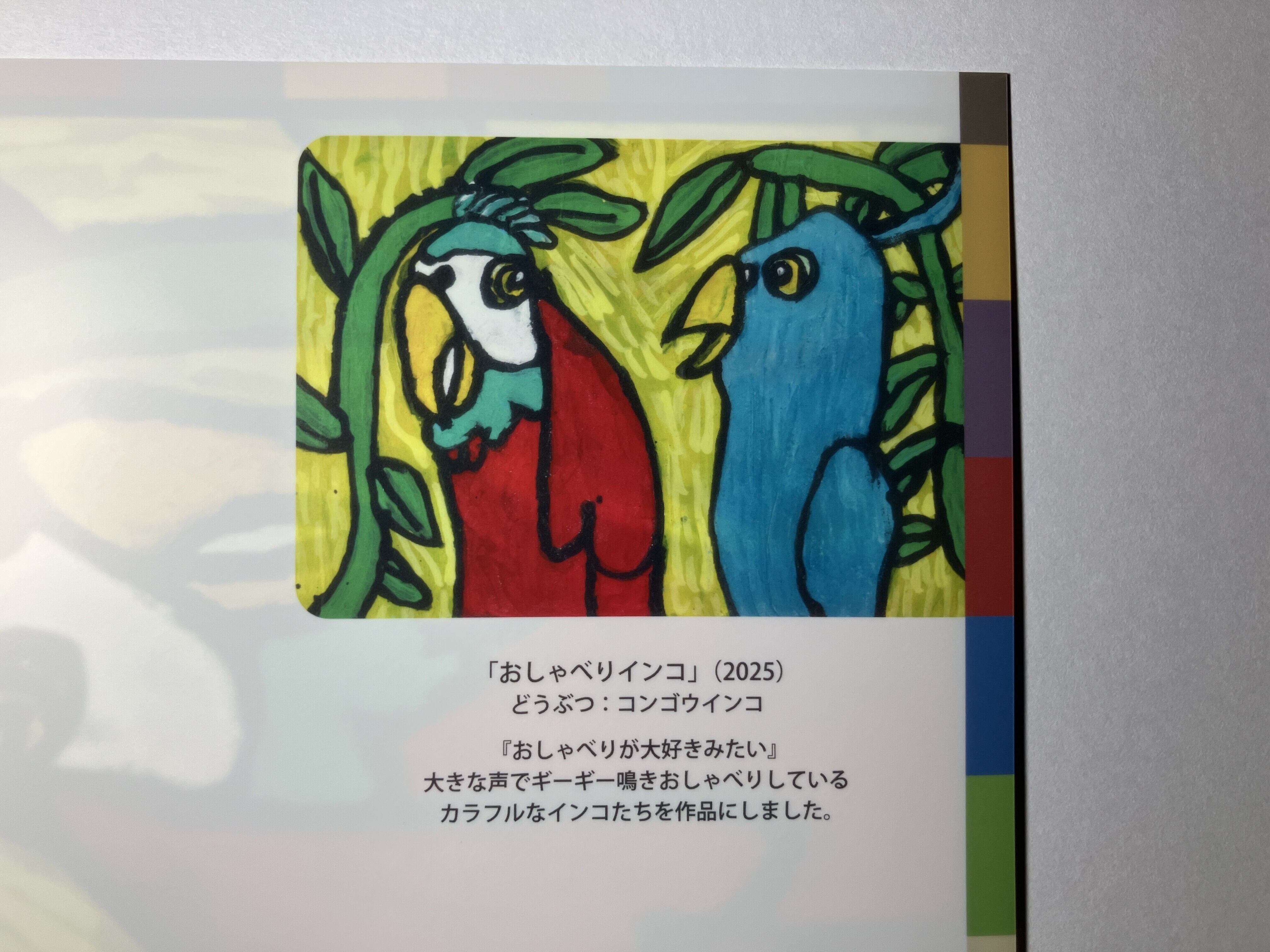 「おしゃべりが大好きみたい」大きな声でギーギー鳴き、おしゃべりをしているカラフルなインコたちを作品にしました。